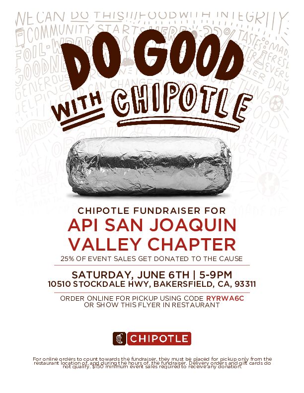 Fundraiser on June 6th from 5 pm to 9 pm at Chipotle on 10510 Stockdale Hwy